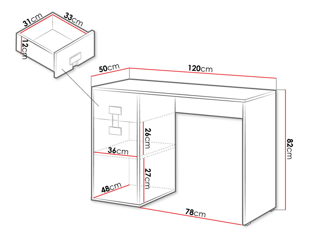 ZobrazitPsací stůl je ideální volbou pro ty, kteří hledají pohodlí a styl. Rozměry: šířka: 120 cm, výška: 82 cm, hloubka: 50 cm. rukojeti: černý plast (výška a šířka 10 cm) nožičky: černý plast 1,5 cm Záruka: 24 měsíců