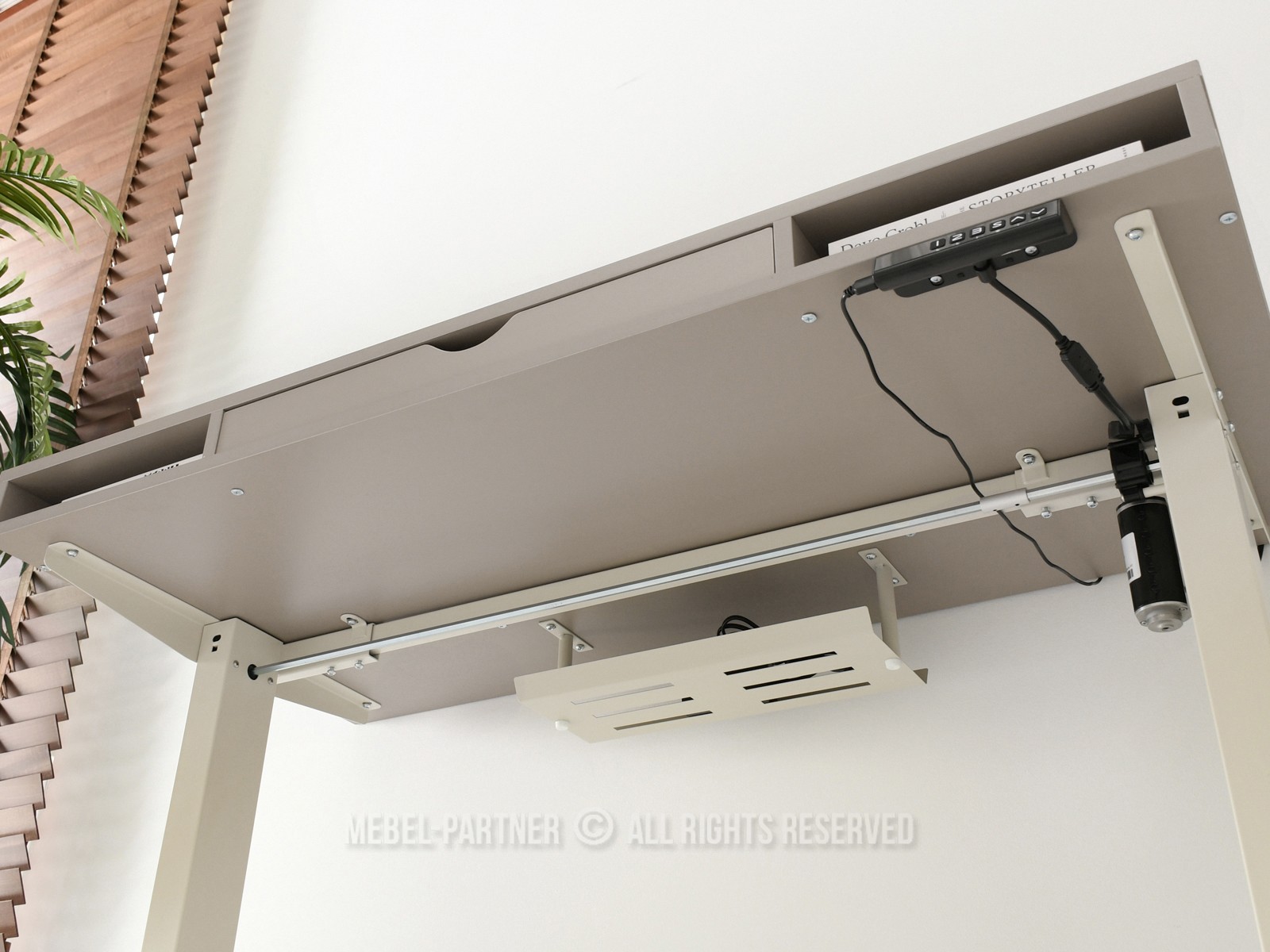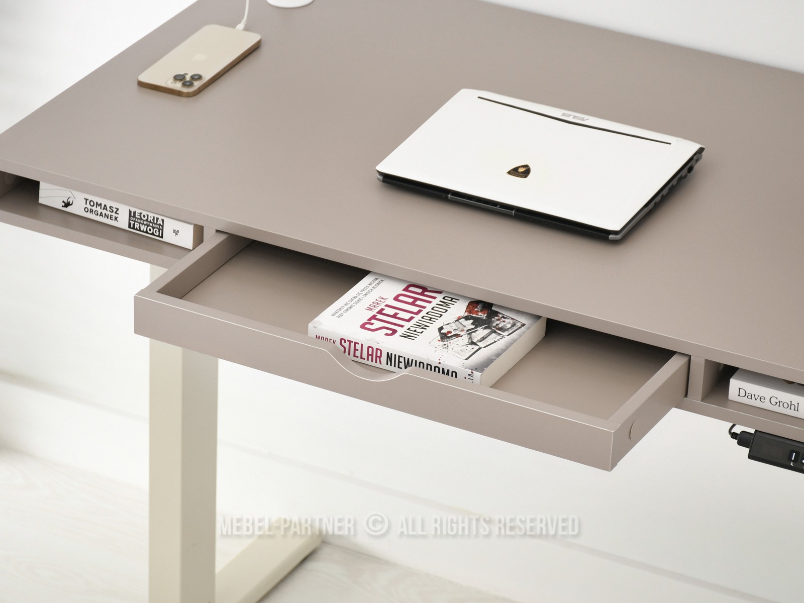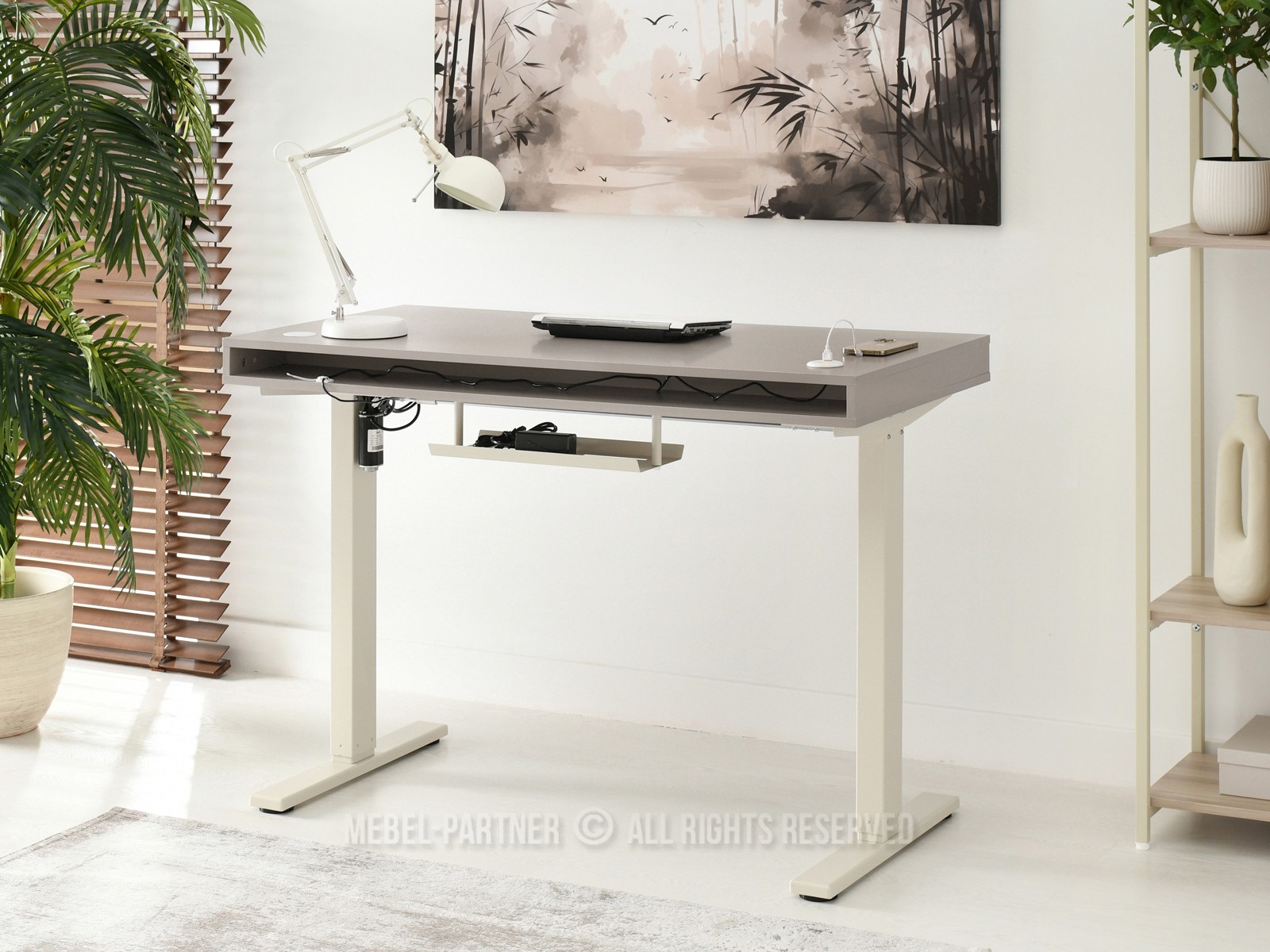 obdélníková deska, s otevřenými policemi, se zásuvkou, s pomocnou policí pod deskou, nastavitelná Výška