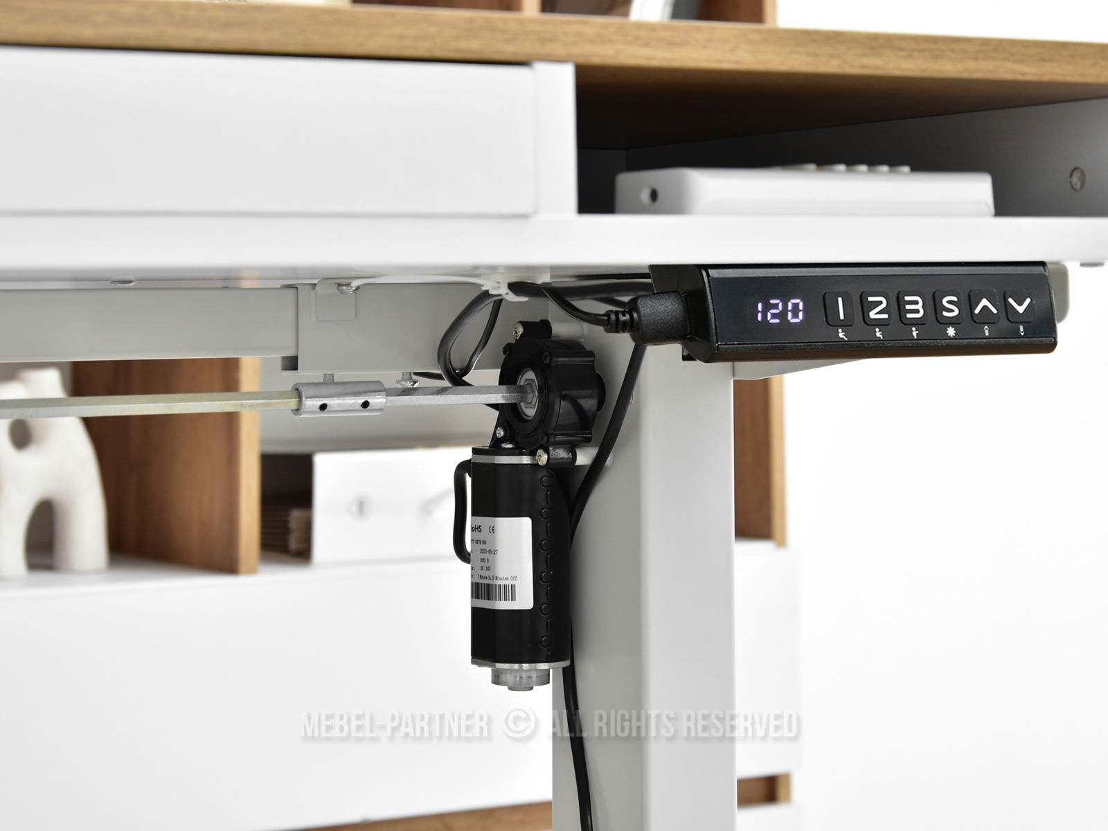obdélníková deska, s otevřenými policemi, se zásuvkou, s pomocnou policí pod deskou
