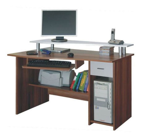 Praktický PC stolek s vyvýšenou plochou na pracovní desce pro umístění monitoru počítače nebo jiných potřebných věcí, které chcete mít vždy poruce. Aby se ušetřilo místo na stole, obsahuje i vysouvatelné plochu na klávesnici a úzkou poličku, kde bezproblémov najde své místo tiskárnu. Vpravo je malá zásuvka a pod ní prostor pro umístění PC skříně. Je vyroben z laminované DTD v barevném provedení dřeva švestka v kombinaci s bílou.