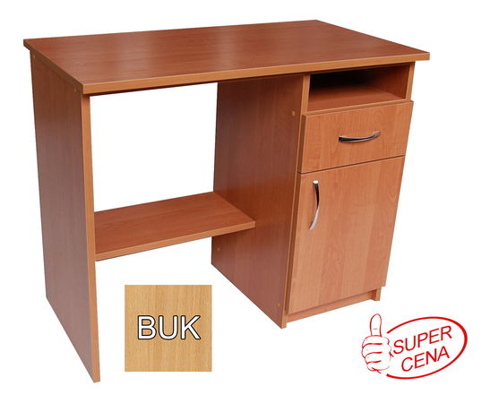 Jednoduchý jednobarevný PC stolek s kompaktními rozměry je ideální do menších pracoven. Na spodku stolku je nad místem pro chodidla umístěna vyvýšená polička určená primárně na tiskárnu. Na pravé straně se nachází jedna skříňka a nad ní se nachází jedna úzká zásuvka. Kvalitu zpracování potvrzuje použití odolných ABS hran na všech místech řezu desky a vybavení stolku odolnými kovovými úchyty. Barevné provedení na výběr: olše, ořech, buk, dub sonoma.