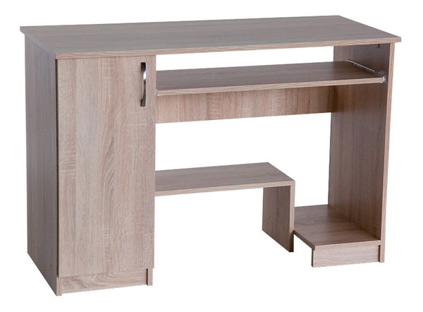 Jednobarevný PC stolek s kompaktními rozměry je ideální do menších pracoven. Výsuvná deska na klávesnici umístěna pod horní deskou na pravé straně značí předurčení stolku na práci s počítačem. Na spodku stolku jsou umístěny 2 poličky a jedna vysoká skříňka. Střední polička je vyvýšená, aby vytvořila místo pro chodidla a určená je primárně na tiskárnu. Vpravo od ní se nachází polička, která je určena na klasickou skříň počítače. Tato polička je umístěna pár centimetrů od země. Na levé straně stolku je umístěna vysoká skříňka s jedněmi dvířky a poličkami uvnitř. Kvalitu zpracování potvrzuje použití odolných ABS hran na všech místech řezu desky a vybavení stolku odolnými kovovými úchyty a kvalitními kolejničkami. Barevné provedení na výběr: olše, ořech, buk, dub sonoma.