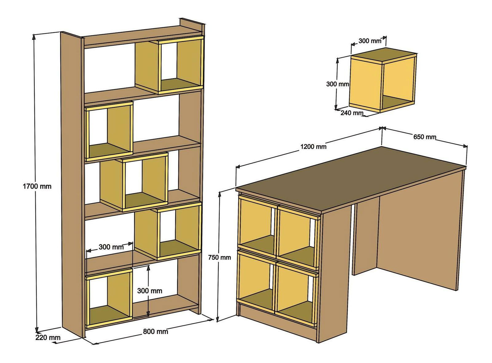 tloušťka: 18 mm, pracovní stůl: šířka: 120 cm, výška: 75 cm, hloubka: 65 cm, polička: šířka: 80 cm, výška: 170 cm, hloubka: 22 cm, velikost nástěnné police: šířka: 30 cm, výška : 30 cm, hloubka : 24 cm