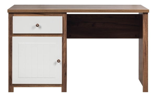 Praktický a zároveň stylový PC stolek, který se bude vyjímat v každé pracovně nebo studentském pokoji. Na levé straně je pod horní deskou umístěna skříňka se zásuvkou a skříňkou pod ní. Zajímavé drobné kulaté úchyty na dvířkách a zásuvce v provedení dub příjemně osvěží světlé provedení.