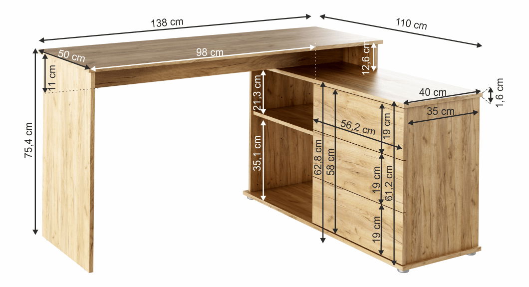 PC stolek Toredol (dub artisan) o výšce 75,4 cm a hloubce 110 cm je skvělým doplňkem pro váš pracovní prostor. Jeho univerzální design umožňuje používání úložného prostoru na obou stranách. Stolek je vyroben z DTD laminovaného materiálu, který zaručí dlouhou životnost výrobku. Barva dub artisan přidává stolku elegantní vzhled a rozměry 138x50/110x75,4 cm zajišťují dostatek místa pro vaše zařízení. Kromě toho, stolek obsahuje 3 zásuvky a otevřenou poličku pro snadný přístup k vašim věcem. Stolek Toredol se hodí do každého pracovního prostoru a je kvalitním slovenským výrobkem. Dodává se v demontu, který zaručuje snadnou přepravu a snadnou montáž.