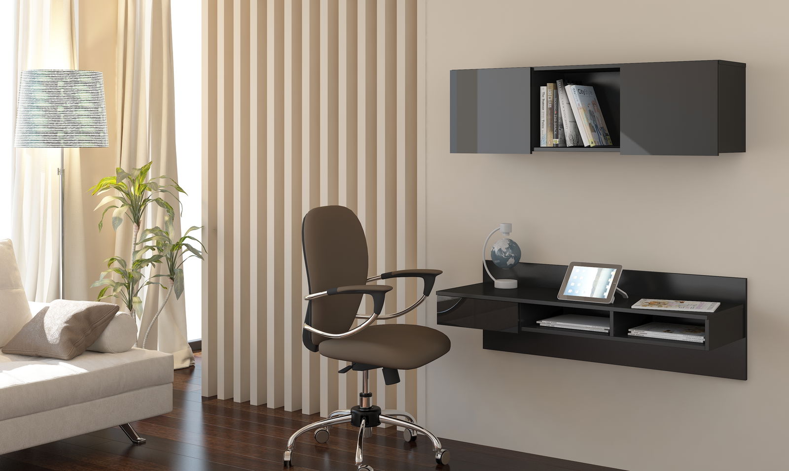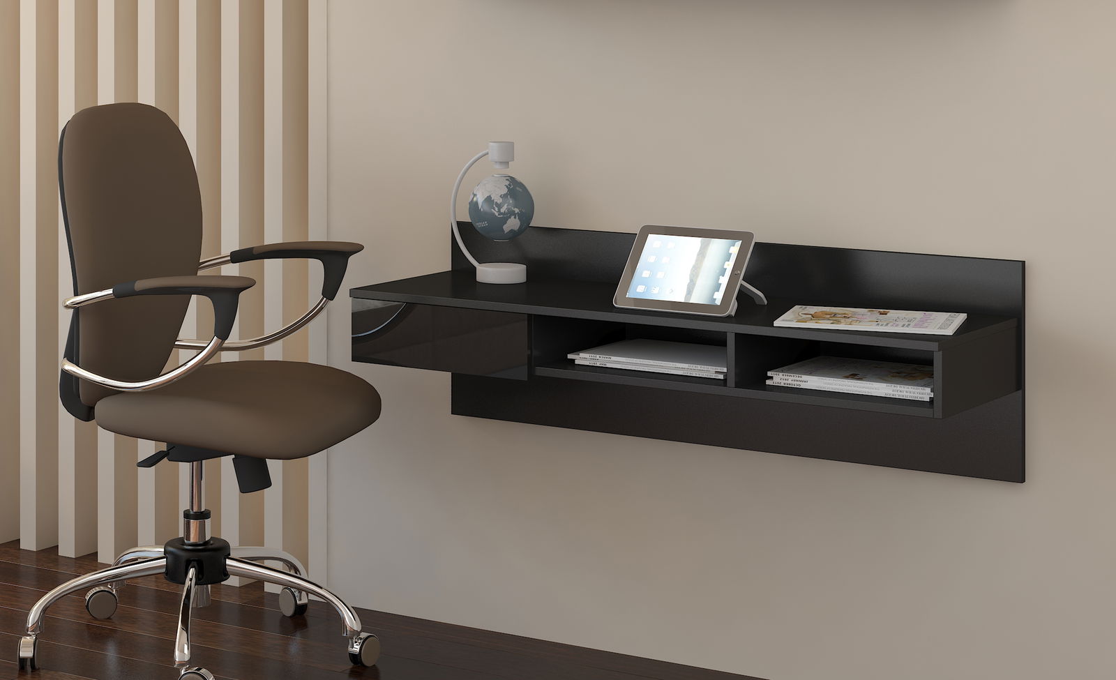 ZobrazitPC stolek Uno vás jistě osloví svým minimalistickým designem a možností praktického umístění na stěnu. Pracovní deska PC stolku je vhodná pro tablet nebo notebook. Na levé straně se nachází menší zásuvka a uprostřed a na pravé straně dvě otevřené poličky na odkládání. Barevné provedení PC stolku Uno je černá v kombinaci s černým leskem.