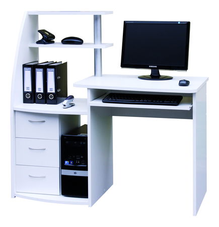 Stolek Viking nabízí množství úložného prostoru při jeho kompaktních rozměrech. To i díky své levé části, kde se nachází dvoupolicový systém, pod kterým se nacházejí ještě tři zásuvky. Umístění klávesnice a myši je možné na výsuvné ploše stolku. Tento model se vyrábí v bílé barvě.
