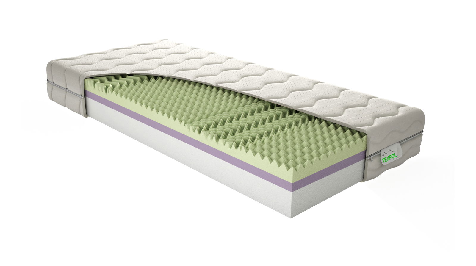 Komfortní, pěnový, oboustranná matrace složený ze tří vrstev kvalitní PUR pěny různých tuhostí. Strana s 5 zónovou profilací přispívá k zrelaxování celého těla během spánku. Druhá strana matrace s rovným povrchem je vhodná pro ty kteří preferují tvrdší spaní bez profilace.