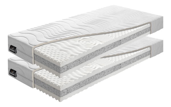 Sendvičová matrace s oboustrannou 7 zónovou profilací kvalitní PUR pěny 30 kg / m3 v kombinaci s tvrzenou deskou POE / RE pěny pro lepší vyztužení matrace. Povrch matrace je tvarován oboustranně do nopů (výstupků), které zlepšují prokrvení pokožky a uvolňují svalstvo během spánku.