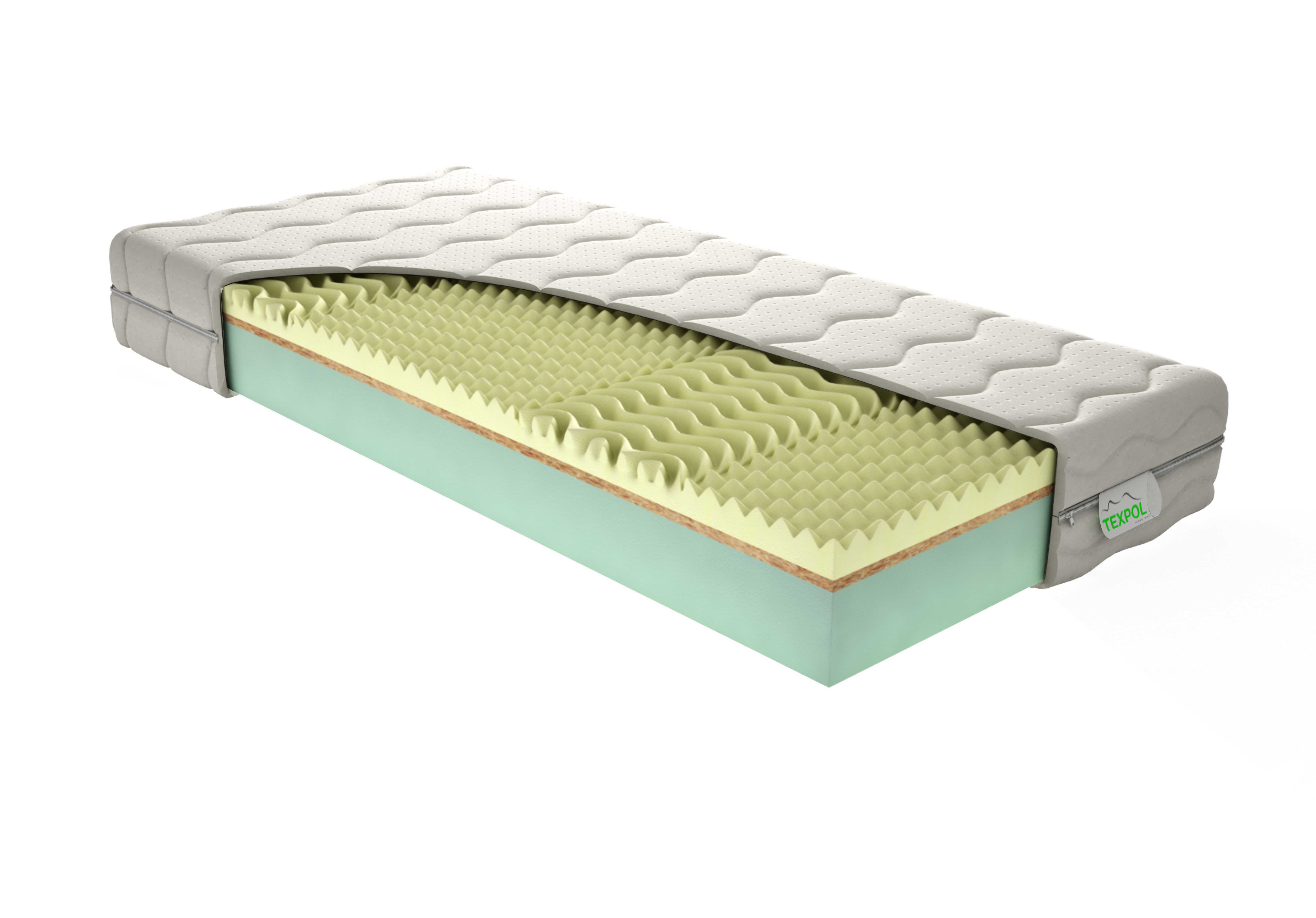 Pěnová matrace Relax se skládá ze tří různých materiálů. Vrchní část tvoří paměťová pěna VISCO profilována do 5 anatomických zón pro uvolnění svalů během spánku. Střední část matrace je tvořena kokosovou vrstvou, která zajistí delší životnost matrace. Spodní část matrace je tvořena studenou HR pěnou.