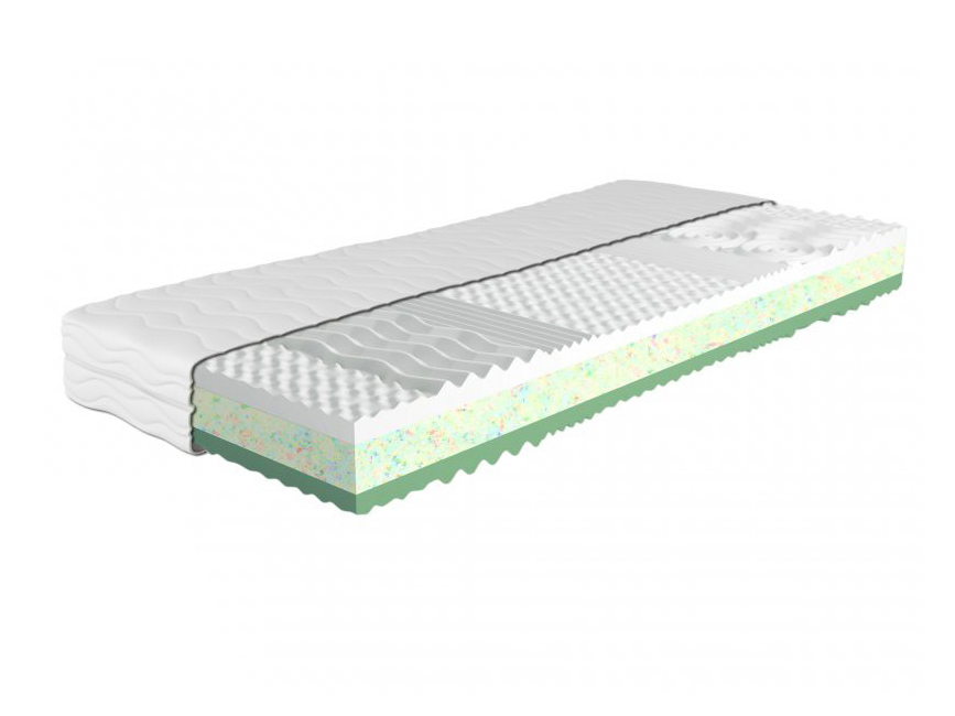 Komfortní sendvičová oboustranná matrace složený z kvalitní PUR pěny a repasované RE pěny. Oboustranná 5-zónová profilace přispívá k vyššímu relaxu během spánku.