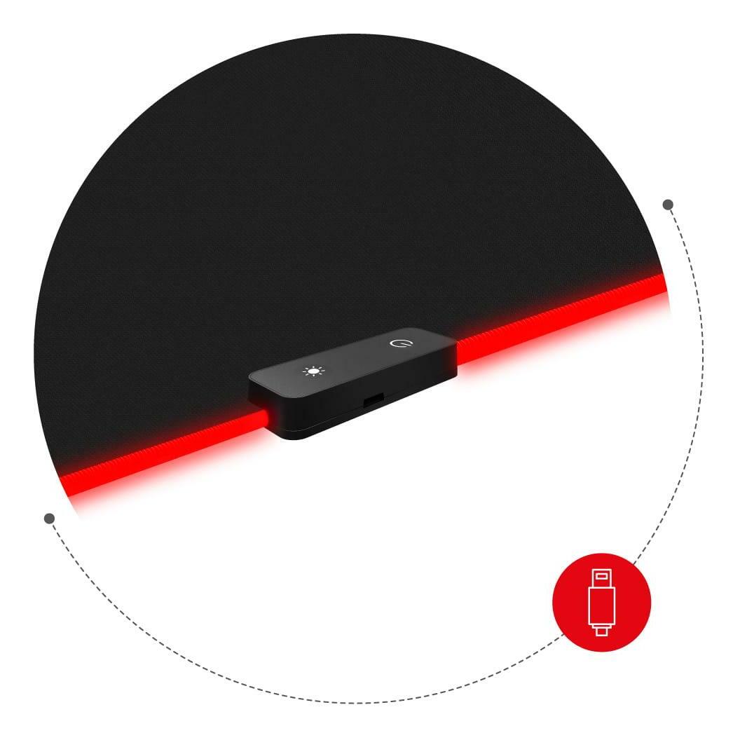 Velká herní podložka, do které se vejde myš, klávesnice nebo dokonce notebook a další počítačové příslušenství. Protiskluzový speciální materiál spojující spodní část podložky s deskou stolu zaručuje pevné uchopení a zabraňuje posouvání podložky po pracovním stole, přičemž vnější materiál je odolný, ale zároveň měkký a příjemný na dotek. Okraje podložky jsou obšity speciálními zesílenými švy, které snižují na nulu riziko mechanického poškození podložky, například neopatrným pohybem. Podložka je vyrobena z pružného materiálu, který dokonale padne na jakýkoli povrch. Materiály jsou příjemné na dotek a mimořádně praktické – udržovat je v čistotě je mimořádně jednoduché. Poutavé RGB LED diody jsou kombinací, která jednoduše vypadá dobře.