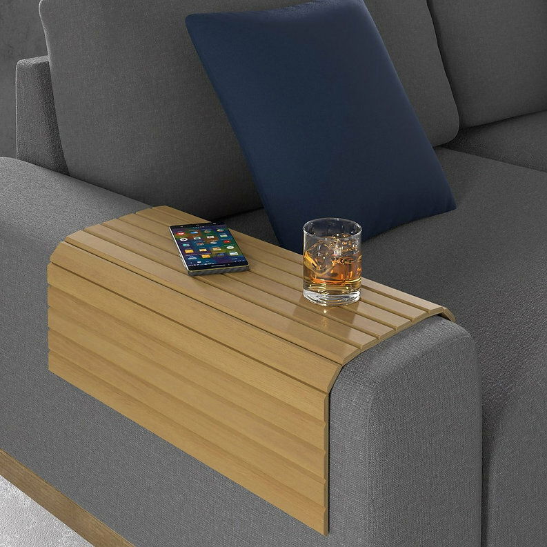 ZobrazitDřevěná podložka je moderní a mimořádně krásný doplněk interiérového designu. Je určena k umístění na boky čalouněného nábytku, čímž vytváří stojan na nápoje nebo občerstvení. Může se také použít jako malý stolek na povrchu postele, pohovky nebo jiného nábytku, kde ochrání před teplotou a vytvoří tvrdý a rovný povrch. Podložka se skládá z dřevěných prvků nalepených na bavlněném plátně.“