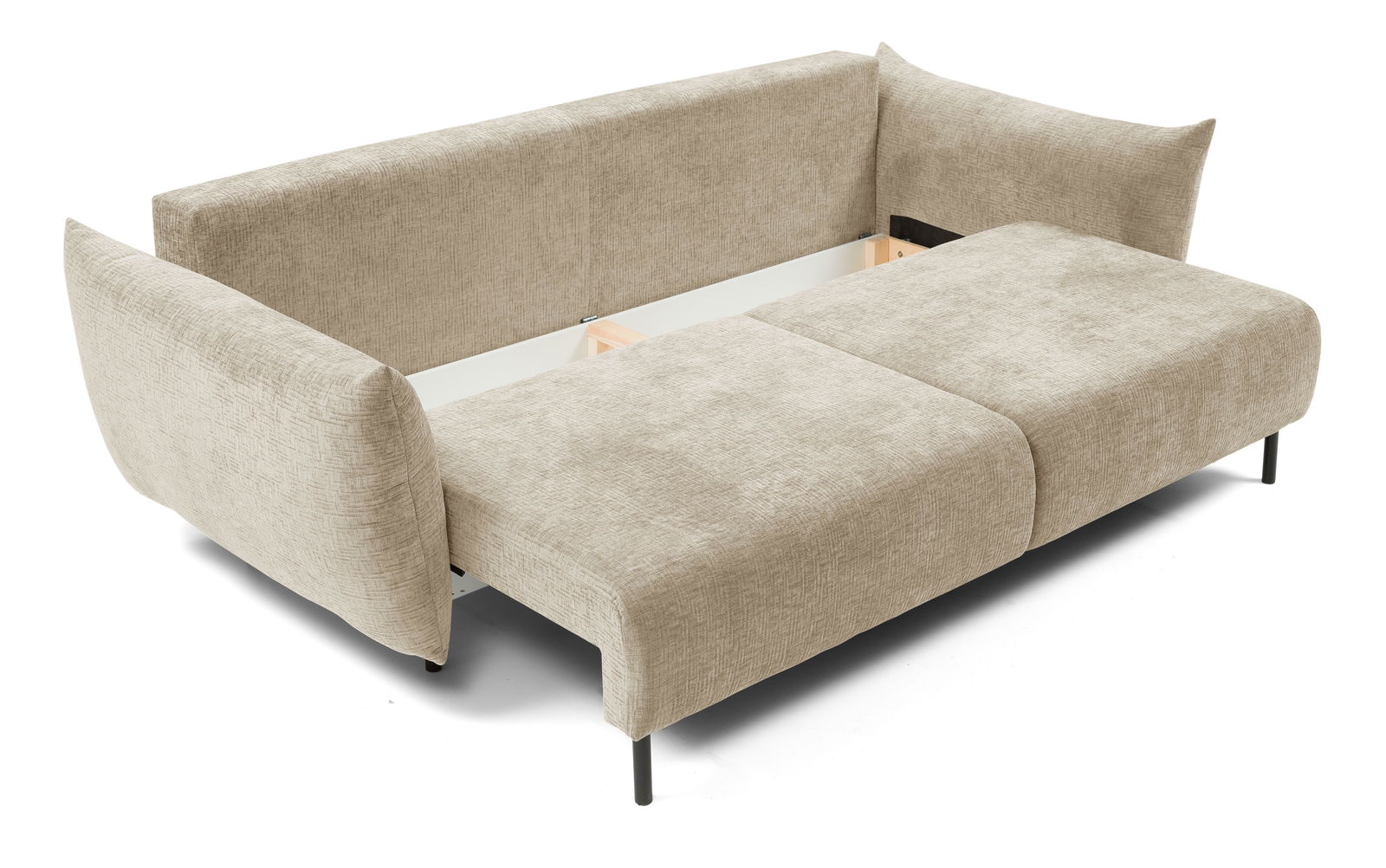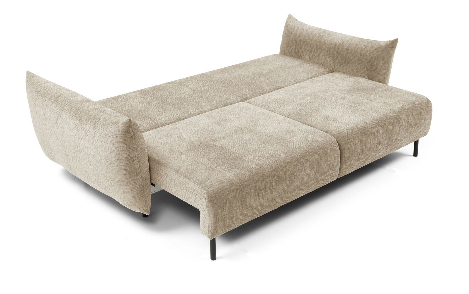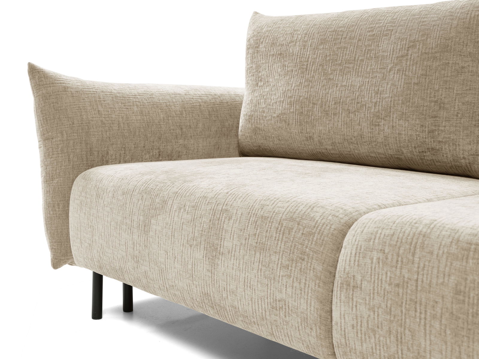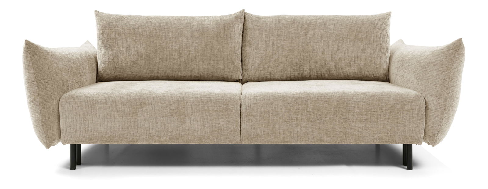 ZobrazitTato pohovka spojuje elegantní design s praktickými funkcemi a pohodlím. Její konstrukce je vyrobena z borovicového dřeva a dřevotřísky, což zajišťuje pevnost a dlouhou životnost. Sedák je vyplněn PUR pěnou T-3042, která poskytuje optimální podporu a pohodlí. Pohovka je rozkládací, přičemž nabízí plochu na spaní o rozměrech 145 x 200 cm. Výška sezení je 44 cm a hloubka sezení 63 cm, což zajišťuje pohodlné posezení. Zádovou opěrku tvoří polštáře, které zvyšují komfort. Pohovka má velký úložný prostor o rozměrech 197,6 x 67 x 12,5 cm, ideální pro uschování různých věcí. Hřbet je potažen stejnou látkou, což dodává pohovce jednotný vzhled. Nastavitelné opěrky hlavy ani područky nejsou součástí designu. Nožičky jsou černé kovové, vysoké 15 cm a dodávají pohovce moderní vzhled a stabilitu. Typ rozkládání je DL. Tkanina „Ovet the horizont“ má jemný vlas, který je velmi příjemný na dotek. Po přejetí rukou se vlas změní směr, což vytváří efekt tvz. mapování, populární v moderním designu. Tento efekt způsobuje, že tkanina může z různých úhlů vypadat rozdílně. Gramáž tkaniny je 430 g/m2, složení 100% polyester, s odolností 28 000 – 32 000 cyklů Martindale. Pohovka se dodává ve dvou balících.