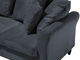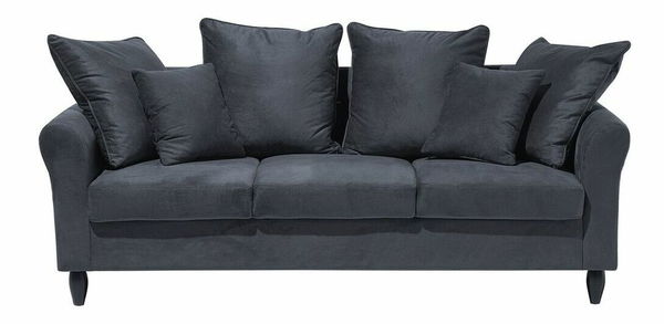 Tato pohovka je opravdu originálním kouskem do každého moderního a elegantního interiéru. Třímístná pohovka s polštáři vyztuženými lehkou a nadýchanou pěnovou výplní je čalouněna šedým polyesterovým sametem, který je příjemný na dotek. Opěradlo se skládá ze šesti polštářů, které pohovce dodávají nádech retro stylu. Spolu se zaoblenými rameny a černýma nohama z eukalyptového dřeva se stane příjemným místem pro setkání s přáteli.