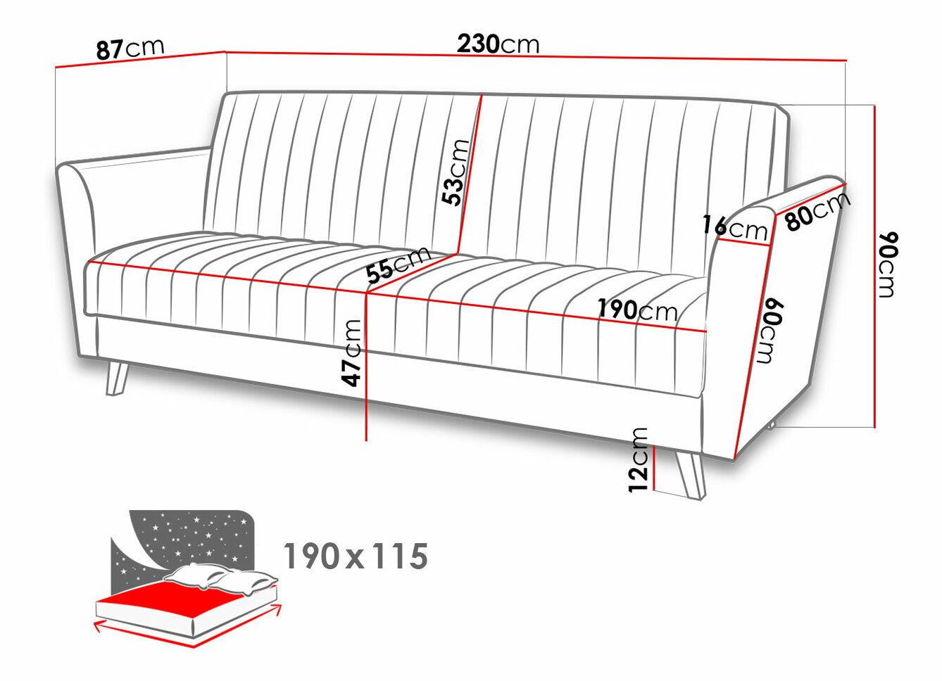 Délka: 230 cm, šířka: 87 cm, výška: 90 cm, plocha na spaní: 190 x 115 cm