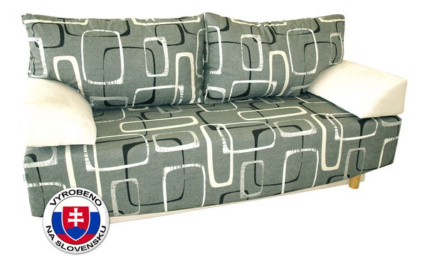 Rozkládací sedačka Santos s úložným prostorem a pružinovými matracemi je vhodná pro každodenní spaní a rozkládání. Obsahuje i polštáře se snímatelnými povlečením. Barevné provedení potahové látky je ze šedého geometrik a Antara cream.