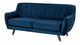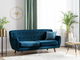 Tato třímístná pohovka s nádherně tvarovaným designem se postará o maximální pohodlí. Opěradlo s prošíváním, boční opěrky a šikmé nohy z kaučukového dřeva jsou inspirovány retro stylem. Pohovka je čalouněna odolným polyesterovým sametem v tmavém odstínu modré barvy. Sedací polštáře mají snímatelné potahy, díky kterým je jejich čištění jednodušší.