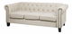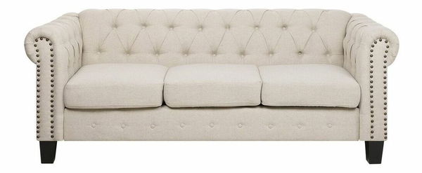 Tato elegantní pohovka v klasickém stylu Chesterfield je perfektním doplňkem do interiérů zařízených ve vintage, retro nebo glamour stylu. Pevná dřevěná konstrukce je doplněna odolným polyesterovým čalouněním v béžové barvě, které je příjemné na dotek. jsou příjemným minimalistickým osvěžením. Nejvyšší komfort zaručují hrubě vyztužené polštáře, které mají snímatelné potahy.
