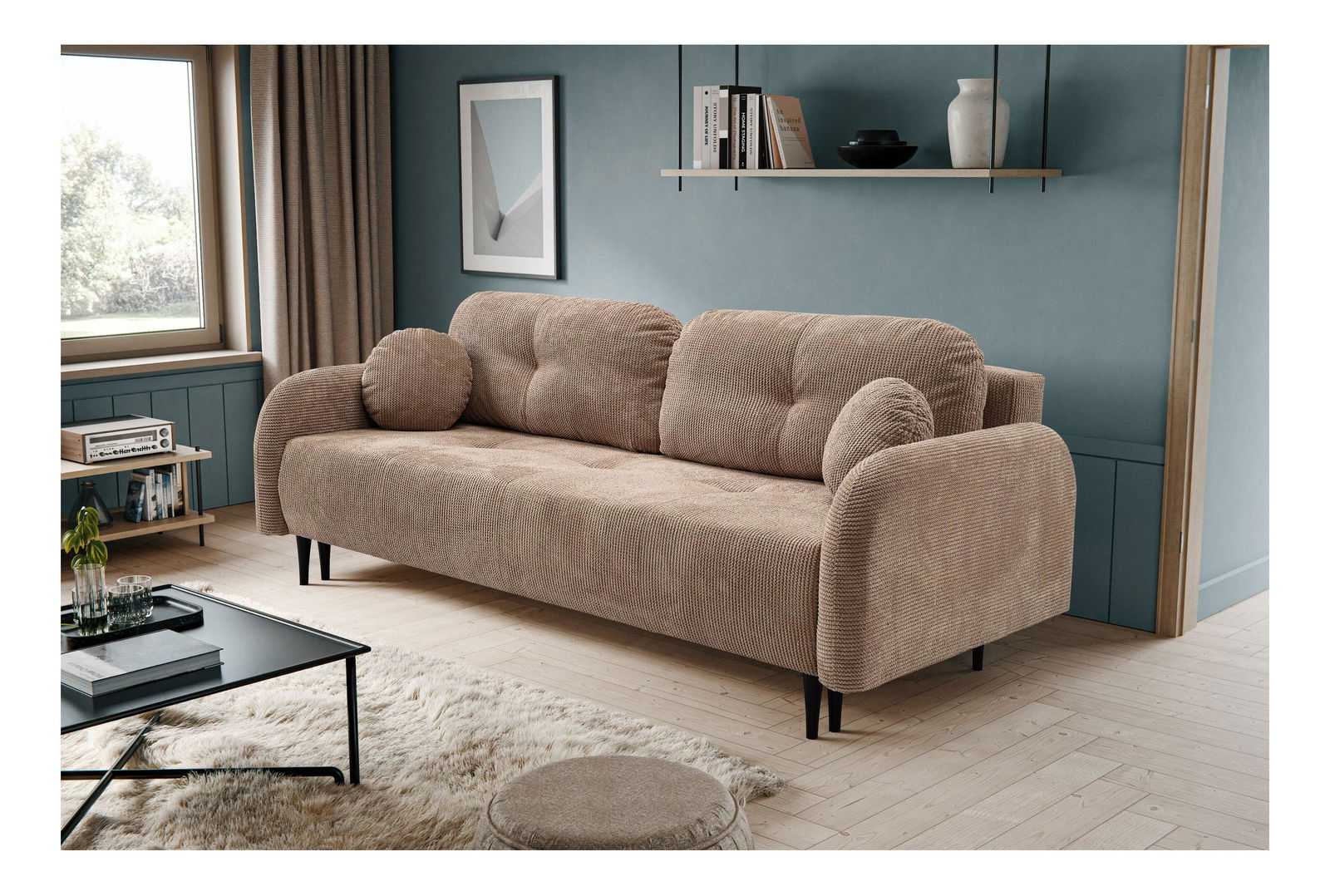 ZobrazitModerní pohovka je skvělým doplňkem pro váš obývací pokoj, který kombinuje styl, komfort a praktičnost. Její konstrukce ze dřeva, dřevotřísky a překližky zaručuje pevnost a dlouhou životnost, zatímco sedák z PUR pěny a pružin poskytuje maximální pohodlí. Pohovka je rozkládací, s plochou na spaní 140 x 200 cm, takže nabízí dostatek místa pro pohodlné přespání. Výška sezení je 45 cm, hloubka sezení 57 cm a výška područky 63 cm zajišťují optimální pohodlí a oporu. Pohovka má praktický úložný prostor a záda potažená stejnou látkou, což zajišťuje jednotný a elegantní vzhled. Přestože nemá nastavitelné opěrky hlavy ani područky, její dřevěné nožičky o výšce 16 cm přidávají pohovce na eleganci a vzdušnosti. Typ rozkládání DL automat usnadňuje manipulaci a tkanina Elma dodává pohovce moderní a stylový vzhled.