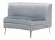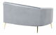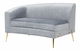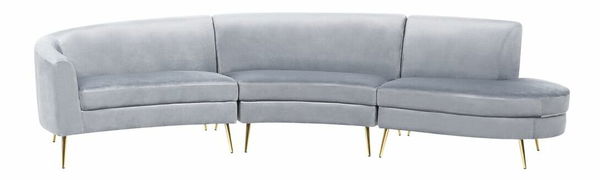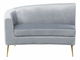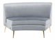 Tato okouzlující pohovka se zaobleným tvarem a retro designem se stane středobodem jakéhokoli obytného prostoru. Její čalounění je vyrobeno ze sametu jemného na dotek v krásné světle šedé barvě, která se výborně kombinuje s různými polštáři nebo přikrývkami. Celkový design podtrhují zlaté kovové nohy, které jí dodávají nádech stylu glamour. Hrubá sedadla a vysoké opěradlo zaručí dokonalý pocit pohodlí během rozhovorů s přáteli nebo při sledování televize.