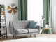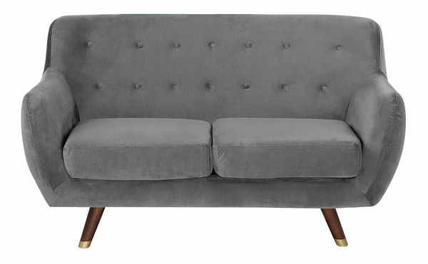 Tato dvoumístná pohovka s nádherně tvarovaným designem se postará o maximální pohodlí. Opěradlo s prošíváním, boční opěrky a šikmé nohy z kaučukového dřeva jsou inspirovány retro stylem. Pohovka je čalouněna odolným polyesterovým sametem v neutrálním odstínu šedé barvy. Sedací polštáře mají snímatelné potahy, díky kterým je jejich čištění jednodušší.