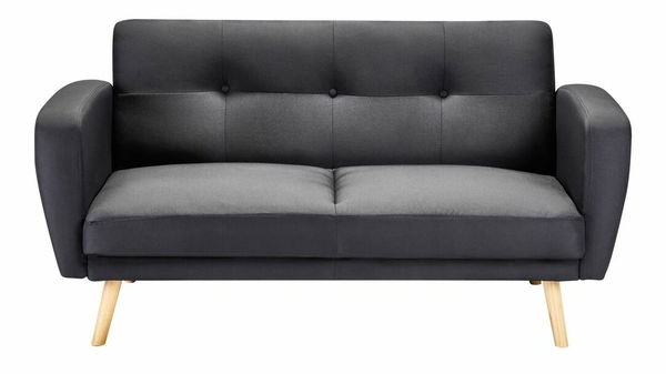 Moderní černá pohovka navržená v retro stylu je skvělým řešením do menších prostor. Široké a hrubé čalouněné sedátko nabízí pohodlné sezení pro dvě osoby a díky rozkládacímu mechanismu lze jednoduše změnit na dvoulůžkovou postel. Pohovka má odolné látkové čalounění se stylovým prošíváním a zešikmené dřevěné nohy.