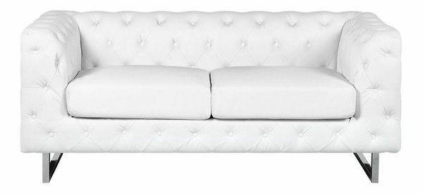 Vylepšete svůj obývací prostor a dodejte mu půvab s touto dvoumístnou čalouněnou pohovkou. Její elegantní design, který je inspirován stylem Chesterfield v kombinaci se stylem tuxedo, se hodí do každého moderního, ale i tradičně zařízeného interiéru. Pohovka s kvalitním bílým čalouněním z umělé kůže má nohy z nerezavějící oceli, tlusté sedací polštáře pro lepší komfort a výrazné prošívání s knoflíky.