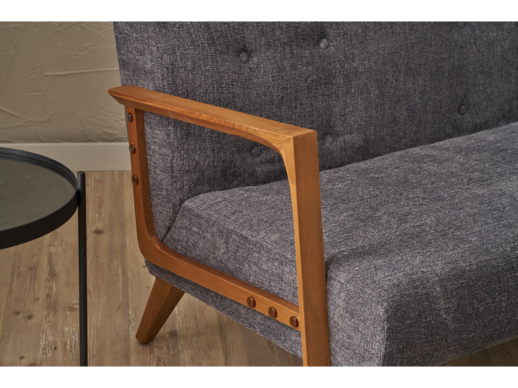 Tento produkt je vyroben z tkaniny az bukového dřeva. Jeho rozměry jsou šířka 114 cm, výška 80 cm a hloubka 85 cm, což z něj činí ideální doplněk pro vaši domácnost.