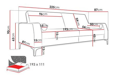 Pohovka je ideální volbou pro ty, kteří hledají pohodlí a styl. 3-místná pohovka Facundo poskytuje příjemné podmínky pro odpočinek s šálkem kávy v ruce, jakož i pro zdřímnutí po obědě. Optimální velikost nábytku je jak stvořená pro návštěvy hostů, tak pro líné odpoledne s rodinou u televizní obrazovky. Výhodou gauče je rozkládací funkce. Rychlou a jednoduchou přípravu místa k odpočinku zajišťuje zabudované automatické zařízení, které usnadňuje rozklad gauče. Kromě toho má pohovka i úložný prostor na ložní prádlo, který po probuzení vyřeší starosti s uložením polštářů a přikrývek. Pokojová sedačka Facundo je dostupná v univerzálních barvách, díky čemuž vypadá skvěle jak v moderním interiéru, tak v loftových a skandinávských interiérech. Moderní nohy mu dodávají lehkost a stylový charakter. Rozměry: délka: 225 cm, šířka: 87 cm, výška: 90 cm, plocha na spaní: 193 x 111 cm, Rozměry kontejneru: délka: 177 cm, šířka: 80 cm, výška: 14 cm Provedení: rám: dřevěný rám, sedák: T25 pěna + vlnové pruž pohovka je rozkládací, má funkci spánku, nádoba na podestýlku, automatický stroj, který usnadňuje rozkládání, kovové nohy, výška 13 cm, dva malé polštářky v ceně, čalouněné opěradlo pevně fixované, pohovka není volně stojící (záda není potažena látkou) Záruka : 2