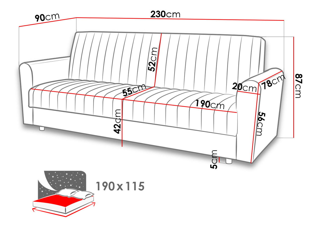 ZobrazitPohovka je ideální volbou pro ty, kteří hledají pohodlí a styl. Hledáte elegantní gauč pro obývací pokoj? Náš návrh je pohovka Goldea . Pohovka má elegantní tvar s usměrněnými loketními opěrkami. Dekorativním prvkem pohovky je vertikální prošívání, které probíhá podél opěradla a sedáku. Prošívání jde dokonale s použitou tkaninou. Díky tomuto typu materiálu je pohovka elegantní. Další výhodou pohovky je funkce na spaní a nádoba na ložní prádlo. Pohovku můžete snadno rozložit. Spací plocha je 190 x 115 cm, což zaručuje pohodlný spánek pro dva. Rozměry: délka: 230 cm, šířka: 90 cm, výška: 87 cm, plocha na spaní: 190 x 115 cm Provedení: rám: borové dřevo + dřevotříska + MDF, sedák: T25 / 42 pěna + pružinová pružina, opěradlo: T25 / 42 funkci spánku úložný prostor na ložní prádlo, automatický skládací stroj CLIC-CLAC, nohy: dřevěné ve stříbře, čalouněné opěradlo pevně připevněné, pohovka není volně stojící (zad není čalouněný látkou) Rozměry úložného prostoru: - délka: 167 cm, - šířka měsíců