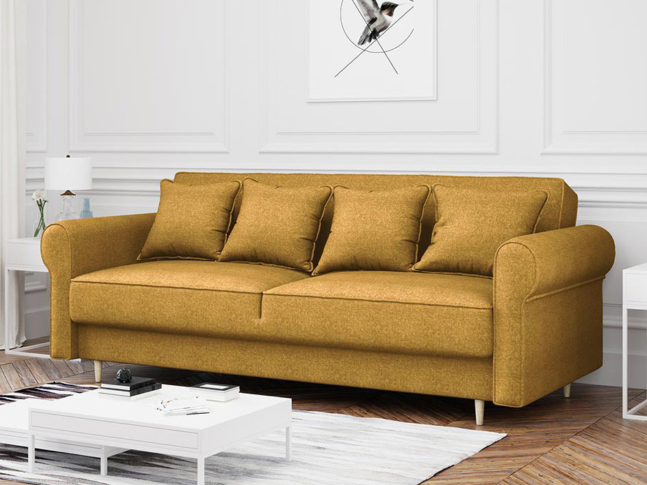 Pohovka trojsedačka Kathryx (žlutá) s výškou 88 cm a hloubkou 105 cm a nornou 65 je ideálním doplňkem vašeho interiéru. Její rám je vyroben z masivního dřeva a dřevotřísky, čímž je zajištěna dlouhá životnost. Sedací část je vybavena bonellovou pružinou o tloušťce drátu 2,4 mm a pěnou T 30 o tloušťce 3 cm, které zaručují komfort během sezení. Podpůrný mechanismus otevírání zajišťuje jednoduchou transformaci z pohovky na třímístné lůžko. Rozměry spacího místa jsou 183 x 122 cm. Typ rozkladu je klik-klak. Výrazná žlutá barva dodává pohovce moderní a stylový vzhled, který bude jistě lákat.