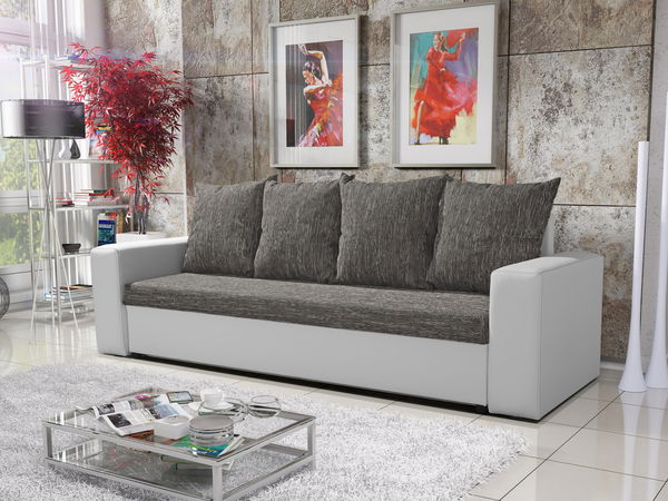 Pohovka trojsedačka Monarda (šedá + bílá) je ideální pro zařízení vašeho obývacího pokoje. Tato sedačka je vyrobena z ekokůže a hrubší strukturované tkaniny ve dvoubarevné kombinaci. K tomu, abyste se cítili jako doma, jsou přidány čtyři velké polštáře na zádové části. Sedačka má také úložný prostor, který je nenápadně ukrytý v zadní části. Konstrukce pohovky je z masivního dřeva a desek ze dřeva o tloušťce 16 mm a překližky. Výplň sedáku sestává z polyuretanové pěny o hustotě 25 kg/m³ - T2544. Pohovka má také rozkládací možnost a rozměry plochy na spaní jsou 195 x 138 cm. Výška sezení pohovky je 40 cm, hloubka sezení s polštáři 58 cm a bez polštářů 70 cm. Bez polštářů je výška pohovky 76 cm. Rozkládací pohovka má také úložný prostor o rozměrech 56x194x27 cm. Tkanina Kornet je hustá látka se strukturou a melírovaným efektem, která se zdá vhodná na pohovky, křesla a polštáře. Tento typ tkaniny je náročný na údržbu. Ekokůže Mandarin MA je kvalitní imitace pravé kůže. Materiál je měkký, flexibilní, odolný a barvostálý. Tento typ tkaniny můžete mýt jemně navlhčeným hadříkem. Test oděruvzdornosti Martindale pro Kornet je 40 000 cyklů a pro ekokůži Mandarin MA je 30 000 cyklů. Poštovné zahrnuje dva balíky: Balíček 1: 57x87x198 cm - 70 kg a Balíček 2: 62x43x87 cm - 19 kg.