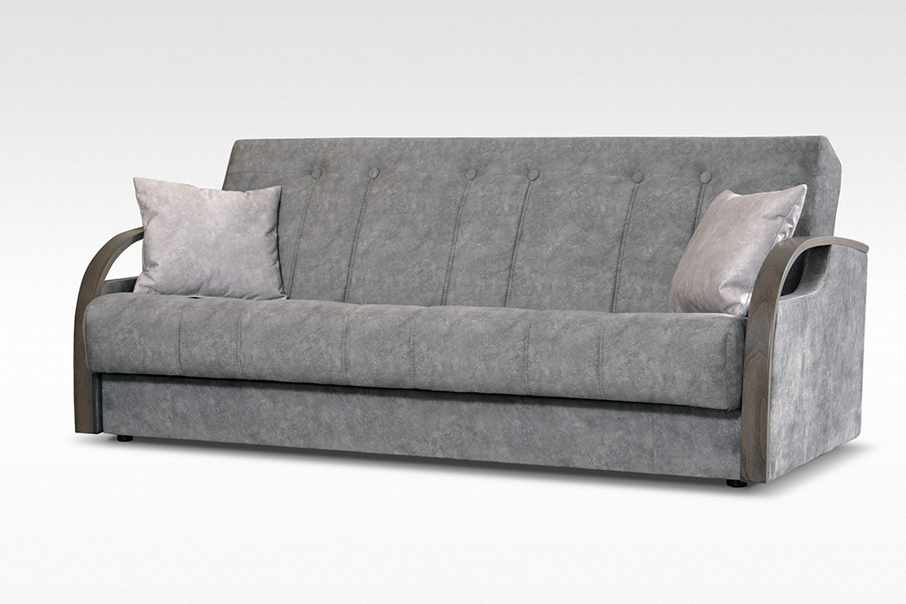 Rozkládací pohovka Norbi je v příjemné šedé zdůrazněna ozdobným prošíváním a bočními dřevěnými vložkami. Pohovka disponuje i s úložným prostorem na lůžkoviny. Polštáře jsou v ceně pohovky.