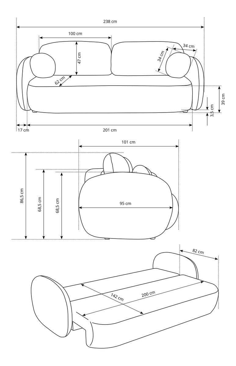 ZobrazitPohovka s konstrukcí ze dřeva a dřevotřísky nabízí spolehlivost a trvanlivost. Sedák je vyroben z PUR pěny T-3042 a T-2542, což zajišťuje pohodlné sezení. Pohovka je rozkládací s plochou na spaní 142 x 200 cm. Výška sezení je 39 cm, hloubka sezení 62 cm a výška područky 68,5 cm. Pohovka má úložný prostor a záda potažená stejnou látkou, což zajišťuje jednotný vzhled. Nastavitelné opěrky hlavy a područky nejsou k dispozici. Pohovka je vybavena plastovými nožičkami o výšce 3,5 cm. Typ rozkládání je DL automat a pohovka obsahuje dva malé polštáře pro větší komfort.