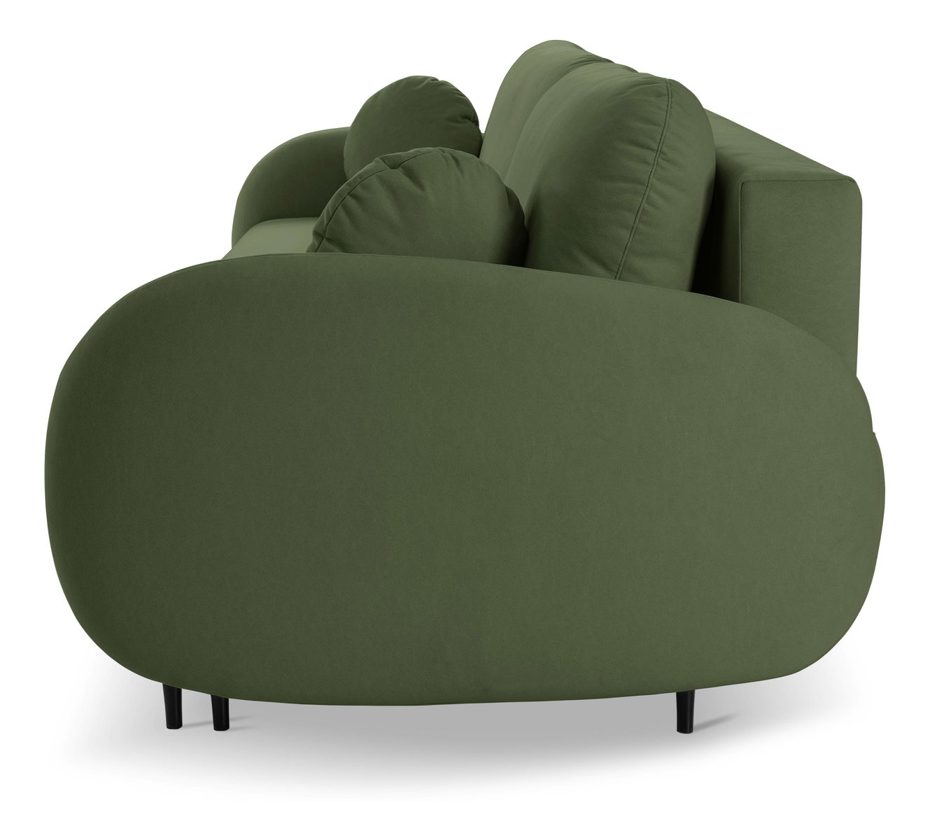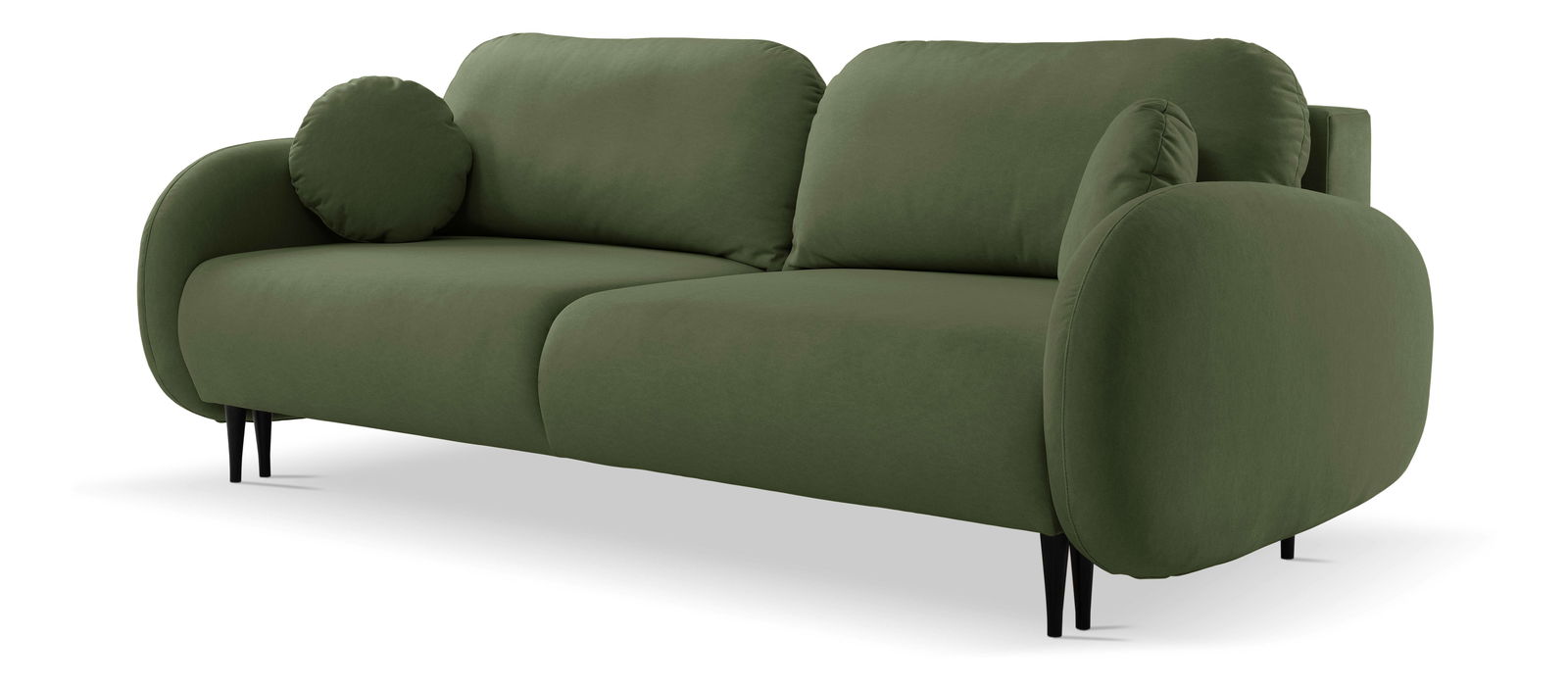 ZobrazitElegantní pohovka přinese do vašeho obývacího pokoje svěží a nadčasový vzhled. Stabilní konstrukci tvoří kombinace dřeva, dřevotřísky a překližky, což zaručuje pevnost a dlouhou životnost. Sedací část je vyplněna kvalitní PUR pěnou a pružinami, díky čemuž poskytuje pohodlí při každodenním sezení i odpočinku. Pohovka se snadno rozkládá pomocí automatického mechanismu a vytvoří komfortní plochu na spaní o rozměrech 140 × 200 cm. Praktický úložný prostor poslouží k uschování ložního prádla či dek. Díky potaženým zádům stejnou látkou ji můžete umístit i do středu místnosti. Součástí balení jsou dva dekorační polštáře, které dotváří celkový design. Dřevěné nožičky působí elegantně a zároveň usnadňují udržování čistoty pod sedačkou. Výška sezení 45 cm a hloubka 57 cm zaručují komfort, zatímco opěrky rukou ve výšce 67 cm podporují přirozené pohodlí. Tato pohovka je ideální volbou pro moderní interiér, kde se pojí styl, funkčnost a praktičnost.