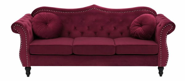 Vylepšete svůj interiér touto elegantní a okouzlující pohovkou. Má prošívané opěradlo a boční opěrky ozdobené kovovým lemováním a je opravdu jedinečným kouskem, který pozvedne vzhled každého prostoru. Design inspirovaný retro a vintage stylem se hodí do jakéhokoli obývacího pokoje či kanceláře. Pohovka je vyrobena z vysoce kvalitních materiálů, je neuvěřitelně odolná a čalouněná jemným sametem. Pevné dřevěné nohy zaručují stabilitu nábytku. Součástí pohovky jsou dva polštáře, které mají snímatelné potahy a lze je jednoduše vyčistit, takže se nemusíte obávat případných skvrn.