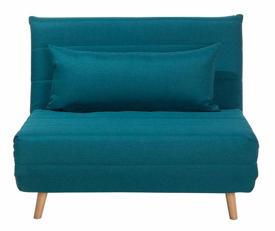 Kompaktní a okouzlující pohovka v modrém barevném provedení je stylovým a zároveň praktickým řešením do jakéhokoli interiéru s omezeným prostorem. Díky dvojitému rozkládacímu mechanismu a nastavitelnému opěradlu lze snadno změnit na pohodlnou postel. Jednoduchý design, který je doplněn horizontálním prošíváním a dřevěnýma nohama, je vhodnou volbou do interiérů zařízených v moderním a skandinávském stylu. Polštář na opěradle má snímatelný potah, který usnadní čištění případných skvrn.