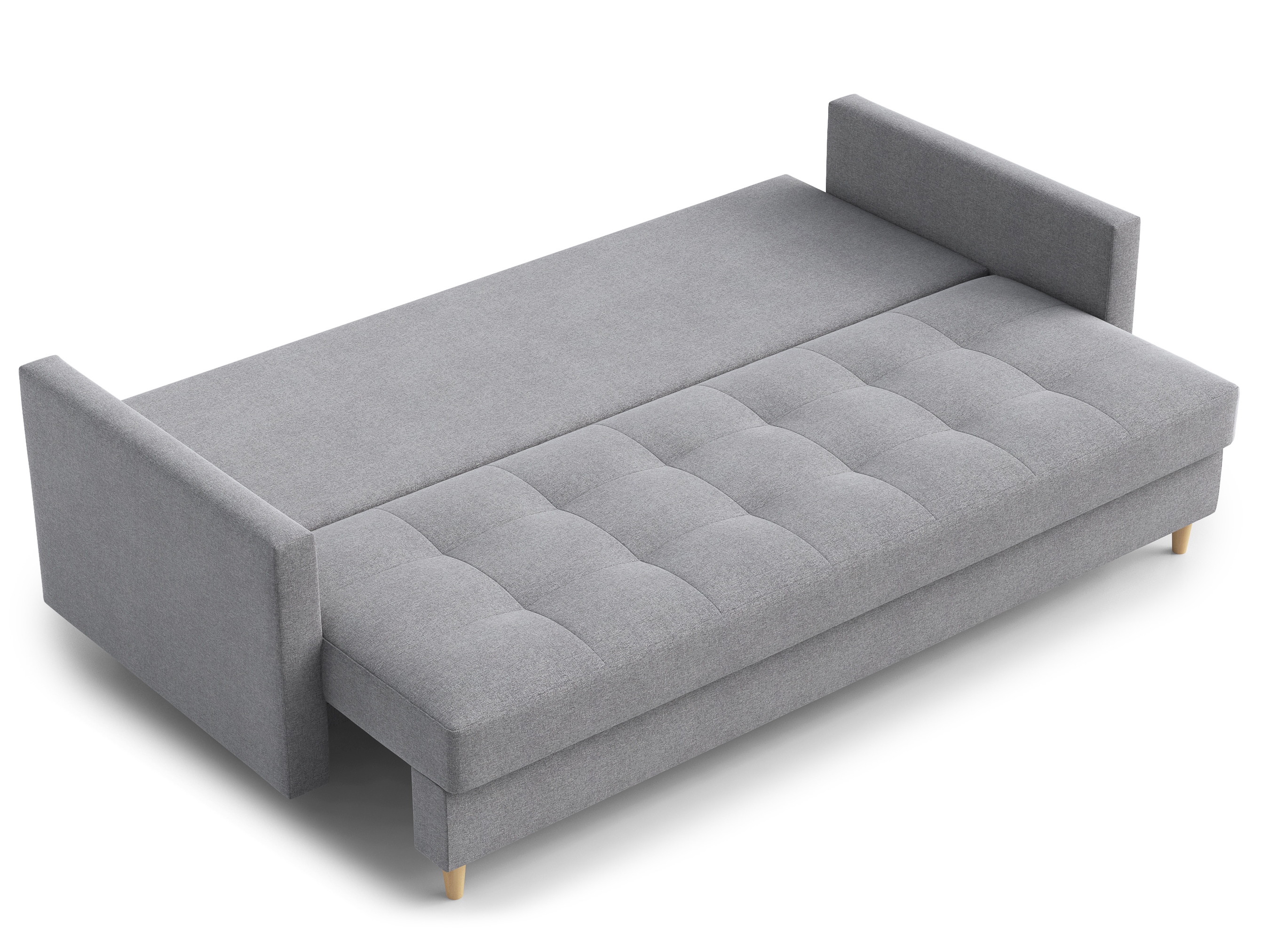 Pohodlná a elegantní trojsedačka, která nabízí styl a funkčnost pro každý obývací pokoj. Postavena na pevné konstrukci ze dřeva a 18 mm nábytkové desky, s materiálem nožiček také ze dřeva a v naturální barvě. Tento nábytek je navržen tak, aby poskytoval komfort díky výplni sedáku a opěradla z bonellových pružin a pěny T 30. Prošívané designové prvky na sedáku a opěradle přidávají elegantní dotek. Nožičky jsou vyhotoveny v naturální barvě a mají výšku 10 cm. S rozměrnou plochou na spaní 200x140 cm, úložným prostorem v bílé barvě a třemi pohodlnými poduškami, tato současně stylová a praktická trojsedačka je ideální volbou pro každý domov. Čalouněná zadní strana umožňuje flexibilitu umístění kdekoli v místnosti.