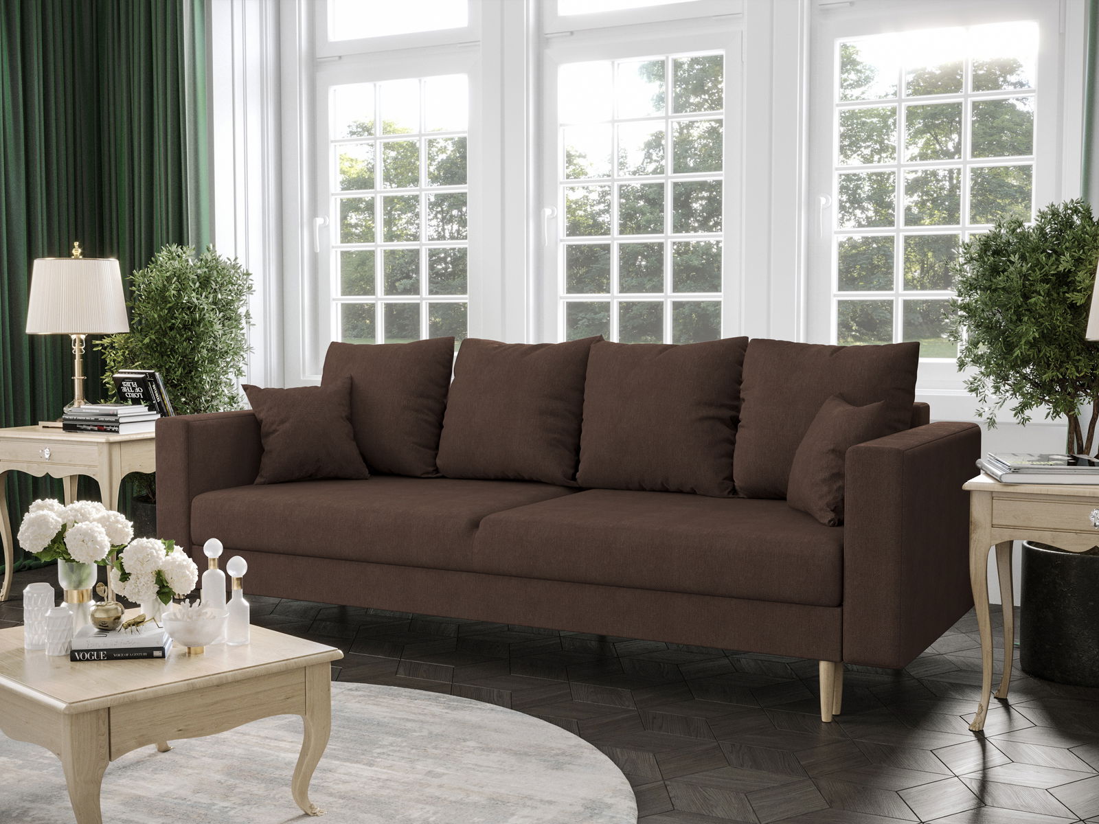 Polštáře a polštáře je doplněna o šest polštářů – čtyři velké opěrkové a dva menší dekorační, které jsou plněny frézovanou pěnou a mají praktické zipy pro snadné čištění. Dřevěné nožičky vysoké 10 cm dodávají nábytku stabilitu a zároveň lehkost, což oceníte při úklidu. Design a styl