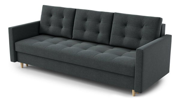 Pohodlná a elegantní trojsedačka, která nabízí styl a funkčnost pro každý obývací pokoj. Postavena na pevné konstrukci ze dřeva a 18 mm nábytkové desky, s materiálem nožiček také ze dřeva a v naturální barvě. Tento nábytek je navržen tak, aby poskytoval komfort díky výplni sedáku a opěradla z bonellových pružin a pěny T 30. Prošívané designové prvky na sedáku a opěradle přidávají elegantní dotek. Nožičky jsou vyhotoveny v naturální barvě a mají výšku 10 cm. S rozměrnou plochou na spaní 120x200 cm, úložným prostorem v bílé barvě a třemi pohodlnými poduškami, tato současně stylová a praktická trojsedačka je ideální volbou pro každý domov. Čalouněná zadní strana umožňuje flexibilitu umístění kdekoli v místnosti.