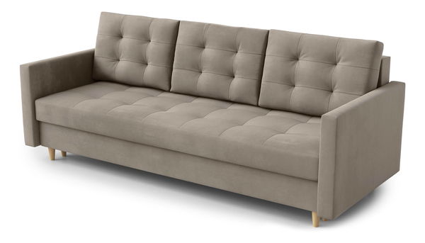 Pohodlná a elegantní trojsedačka, která nabízí styl a funkčnost pro každý obývací pokoj. Postavena na pevné konstrukci ze dřeva a 18 mm nábytkové desky, s materiálem nožiček také ze dřeva a v naturální barvě. Tento nábytek je navržen tak, aby poskytoval komfort díky výplni sedáku a opěradla z bonellových pružin a pěny T 30. Prošívané designové prvky na sedáku a opěradle přidávají elegantní dotek. Nožičky jsou vyhotoveny v naturální barvě a mají výšku 10 cm. S rozměrnou plochou na spaní 120x200 cm, úložným prostorem v bílé barvě a třemi pohodlnými poduškami, tato současně stylová a praktická trojsedačka je ideální volbou pro každý domov. Čalouněná zadní strana umožňuje flexibilitu umístění kdekoli v místnosti.