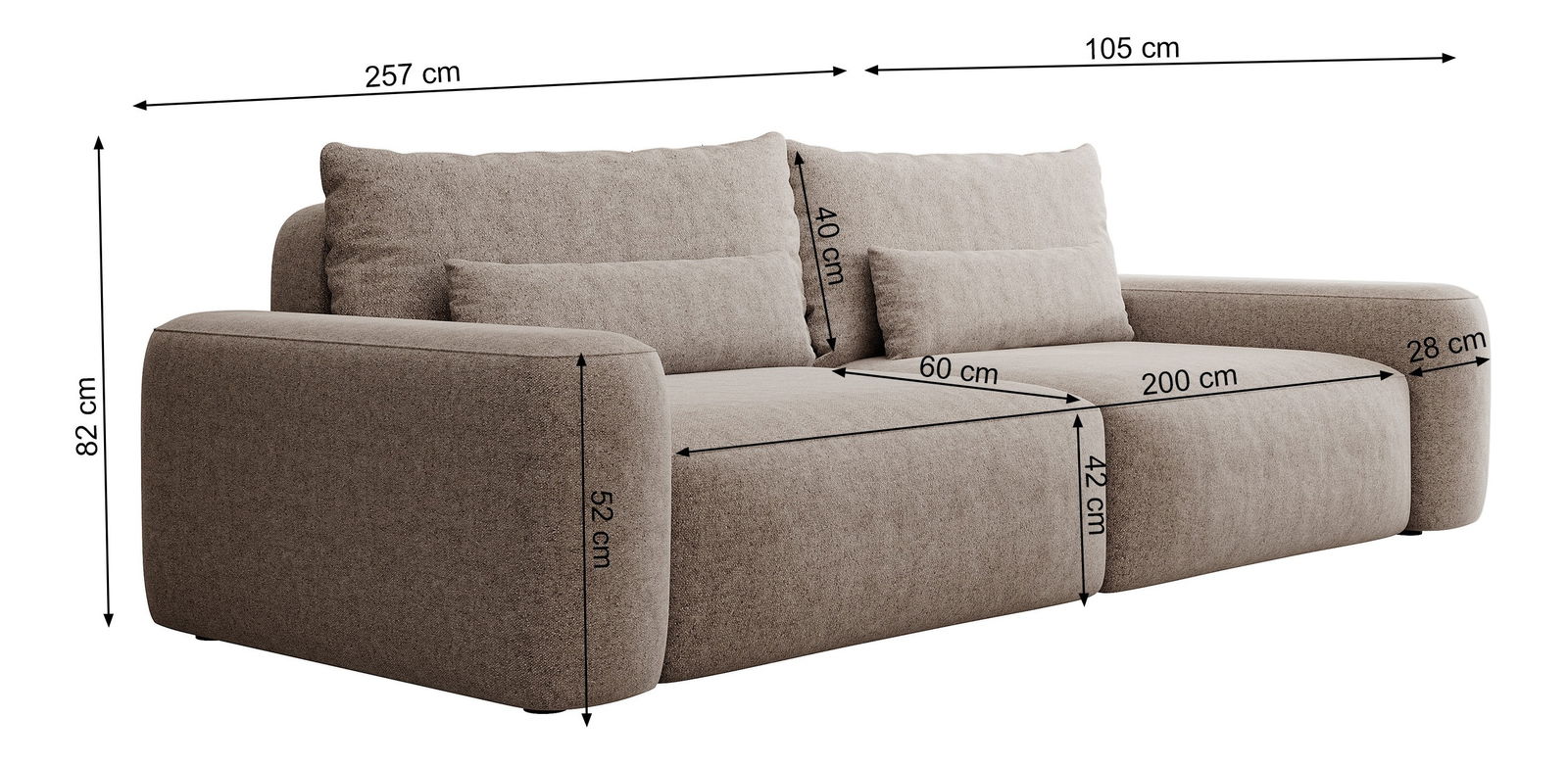 Hledáte pohodlnou pohovku, která potěší nejen svým designem, ale poskytne také dokonalý relax po dlouhém dni? Právě jste to našli! Sedačka je spojením nejvyšší kvality zpracování, estetiky a funkčnosti Třímístná sedačka je spojením harmonických zaoblených tvarů s minimalistickou strukturou, čímž vzniká kus nábytku s mimořádně moderním výrazem! Pohovka vyrobená z vysoce kvalitní žinylkové látky vyzařuje eleganci a pohodlí. Součástí sady jsou vkusné polštářky, které dodají celému tomu neopakovatelné kouzlo. není jen styl a estetika, je to také funkčnost přizpůsobená potřebám každodenního života. Pohovka vybavená mechanismem DL se snadno změní na pohodlné místo na spaní. Rozkládání na spaní se díky automatickému mechanismu stává dětskou hrou. Pohovka navíc obsahuje praktický zásobník na ložní prádlo, který vám umožní udržovat v místnosti pořádek. Pohodlí sedadla je zdůrazněno použitím vlnových pružin typu B v sedadle, které poskytují vynikající oporu a rovnoměrné rozložení hmotnosti těla. Pohovka je ideální volbou pro ty, kteří ve svém okolí oceňují estetiku i funkčnost. Přidejte se k revoluci v pohodlném relaxu! Vyberte si sedačku a objevte ve svém interiéru nový rozměr relaxu! Hledáte něco většího? Určitě si prohlédněte naše rohové pohovky ze stejné kolekce Podrobnosti o produktu: volně stojící model (s čalouněným opěradlem), snadno použitelná funkce na spaní typu DL, praktický kontejner na postel jako standard, vlnové pružiny typu B v! sedátko, dva dekorativní polštáře v ceně, kus nábytku čalouněný látkou Moly 99 v černé barvě, Moly je odolná, odolná látka, která je mimořádně jemná na dotek. Vyrobeno z žinylkové látky, má jemný a jemný vzor s elegantní vazbou, kterou lze nahmatat prsty. Tato látka spojuje originální design s praktickým využitím. Pokryté speciální hydrofobní vrstvou Water Repellent chrání před rychlou absorpcí tekutin. To znamená, že tekutiny neproniknou okamžitě do struktury látky, ale zůstanou na jejím povrchu.