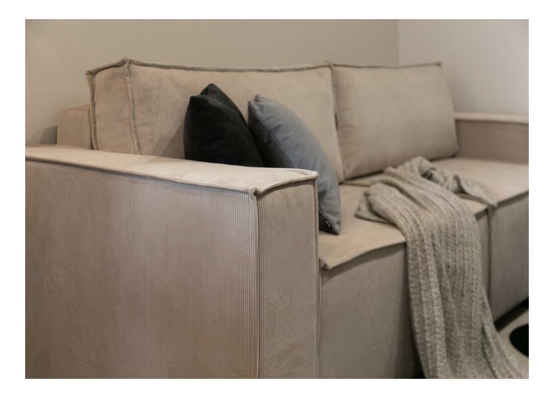 ZobrazitChcete elegantní prostor, kde mohou vaši blízcí pohodlně trávit čas? Kolekce nábytku je skutečným hitem Třímístná pohovka vám umožní vytvořit okouzlující kompozici ve vašem obývacím pokoji, mládežnickém pokoji nebo pokoji pro hosty. Sedačka se vyznačuje jemně zaoblenými plynulými liniemi. Představený kus nábytku působí mimořádně elegantně, přičemž si zachovává oku lahodící lehkost. Díky tomu je konstrukce jako stvořená i do malých místností, kde se stane nedílnou součástí estetického relaxačního koutku, kde si mohou v atraktivním prostředí odpočinout vaši blízcí. Nadčasová barva potahu je výbornou volbou do moderních, boho či skandinávských prostor, kde bude povedená kombinace s bílou či zemitými barvami. Pohovka má výplň z polyuretanové pěny. Toto řešení se promítá do měkkého, pružného povrchu, který uživateli poskytne komfort a přiměřenou oporu pro citlivé body páteře. je doplněno o prostorný kontejner na lůžkoviny a intuitivní funkci DL spánku podporovanou automatickým zařízením Neváhejte a objednejte si ještě dnes! Detaily produktu: volně stojící nábytek - má čalouněná záda, standardní kontejner na lůžkoviny, výška područky: 58 cm, šířka područky: 23 cm, hloubka područky: 94 cm, výška opěradla: 77 cm, rám: dřevotříska + dřevěné výztuhy, nožičky vyrobeny plast, opěrka vyrobená: polyuretanová pěna s hustotou T25145 + dřevotříska + látka, sedátko vyrobeno: polyuretanová pěna s hustotou T25145 + dřevotříska + látka, vyjímatelné polštáře, nábytek čalouněný látkou Scala Toffe (béžový odstín), Scala žebrovaný povrch. Vyznačuje se dobrou odolností proti žmolkování, jakož i odolností proti oděru a tření. Zpomalovač hoření - projde testem cigaret, montáž: svépomocná montáž, zesílené prošívání na polštářích na horním a bočním okraji polštářů.