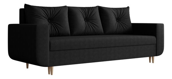 - Tři velké rozkládací pohovky, či multifunkční sedačky. Díky své univerzální černé barvě a minimalistickému designu se snadno kombinuje s různými styly interiéru – od skandinávského, přes industriální až po moderní minimalistický.