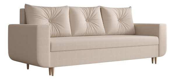 Díky kvalitní konstrukci z dřevěného rámu a dřevotřísky je tato rozkládací pohovka pevná a odolná, což zaručuje dlouhodobé používání. Výplň z pěny T30 a vlnitých pružin typu A zajišťuje příjemný komfort při sezení, zatímco tři velké polštáře s frézovanou pěnou na zip dodávají extra oporu a možnost snadného čištění.