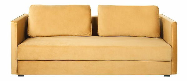 Tato pohovka s moderním designem je dokonalým doplňkem do jakéhokoli moderního, tradičního nebo minimalistického obývacího pokoje. Je čalouněná jemným sametem ve žluté barvě, má tlustá sedadla a opěradla a stabilní dřevěné nohy, které zajišťují nejvyšší úroveň pohodlí. Polštáře na opěradle mají snímatelné potahy, díky kterým bude čištění případných skvrn o něco jednodušší. Tuto elegantní a moderní pohovku lze velmi jednoduše přeměnit na postel a vytvořit pohodlnou alternativu klasické postele pro hosty. Pohovka má také praktický úložný prostor, do kterého můžete odložit prádlo a různé doplňky.