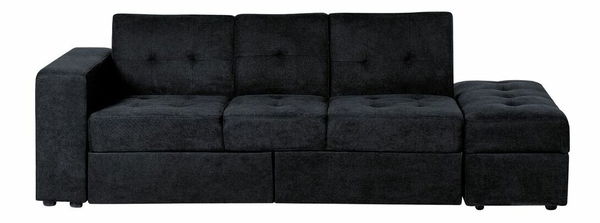 Tato rozkládací pohovka je ideální do menších interiérů a představuje pohodlí a univerzálnost. Skládá se z dvoumístné pohovky, taburetky se skrytým úložným prostorem a dvou prostorných zásuvek pod sedadlem pohovky. Lze ji rozložit na pohodlnou postel. Ložní prádlo lze jednoduše odložit do zásuvek pod sedadlem. Sklopné opěradlo a sklopný podnos s držákem na sklenici se postarají o úžasný komfort. Pohovku můžete rozšířit samostatnou taburetkou. Tato pohovka s čistými liniemi, minimalistickým prošíváním s knoflíky a malýma nohama ze syntetického materiálu je ideální do každého moderního interiéru.