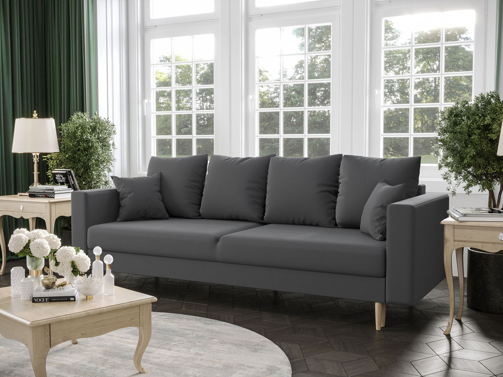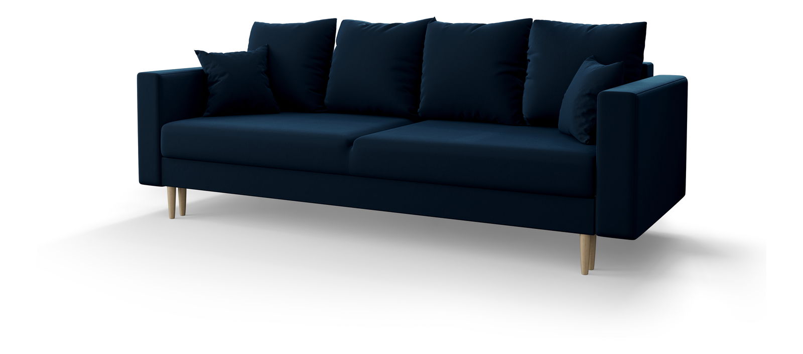 Tmavě modrá barva sedačky je nadčasová a snadno se kombinuje s různými styly interiéru – od minimalistického, přes skandinávský až po industriální nebo moderní. Dřevěné nožičky vysoké 10 cm dodávají nábytku lehkost a přirozený vzhled, který oživí každý prostor. Součástí jsou čtyři velké opěrkové a dva menší dekorační polštáře s výplní z frézované pěny, které zvyšují komfort a zároveň umožňují variabilitu uspořádání podle vašich potřeb.