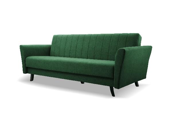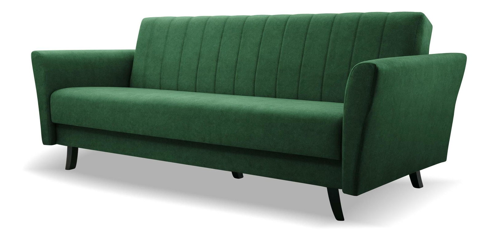 Pohovka trojsedačka - Linear (tmavě zelená) výška 90 cm šířka 227 cm Kronos 19 hloubka 93 cm Retro styl této sedačky dokonale kombinuje tradiční design s moderními prvky. Je vyrobena z masivního dřeva a dřevotřísky, což zaručuje její dlouhodobou odolnost a stabilitu. Sedák a opěradlo jsou vybaveny bonellovou pružinou o tloušťce drátu 2,4 mm a 3 cm silnou pěnou T 30, což poskytuje vynikající komfort při sezení. Sedačka má praktický rozkládací mechanismus typu KLIK-KLAK, díky čemuž se snadno přemění na plochu na spaní o rozměrech 118x195 cm. Je ideální pro hosty nebo jako nouzové lůžko. Kromě toho, sedačka obsahuje také úložný prostor, který je velmi praktický na uložení ložního prádla nebo jiných potřebných věcí. Zadní strana sedačky je potažena stejnou látkou, což umožňuje její umístění uprostřed místnosti bez ztráty estetického vzhledu. Tato třímístná sedačka poskytuje dostatek prostoru pro pohodlné sezení. Je podepřena černými dřevěnými nožičkami o výšce 15 cm, což nejenže zvyšuje její eleganci, ale také usnadňuje čištění pod ní.